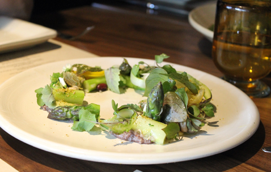 Wild greens salad brought a tangle of pristine leaves hiding spoonable strachino cheese. Spring salad was a beautiful composition arranged in a circular pattern with asparagus tips, artichoke hearts, and crunchy sprouting beans and heirloom grains.