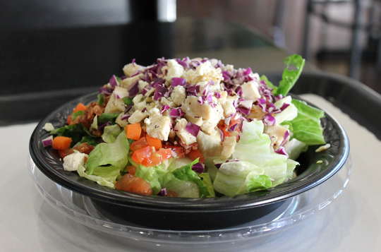 The pieces of iceberg and romaine in the salad were a bit large for a chopped salad, so you missed getting the effect of a little bit of everything in one bite. It did have a nice jumble of tomato, carrots, red cabbage, bacon, scallions, crumbled Gorgonzola, diced chicken breast and a few macaroni noodles. A container of house balsamic dressing came on the side.