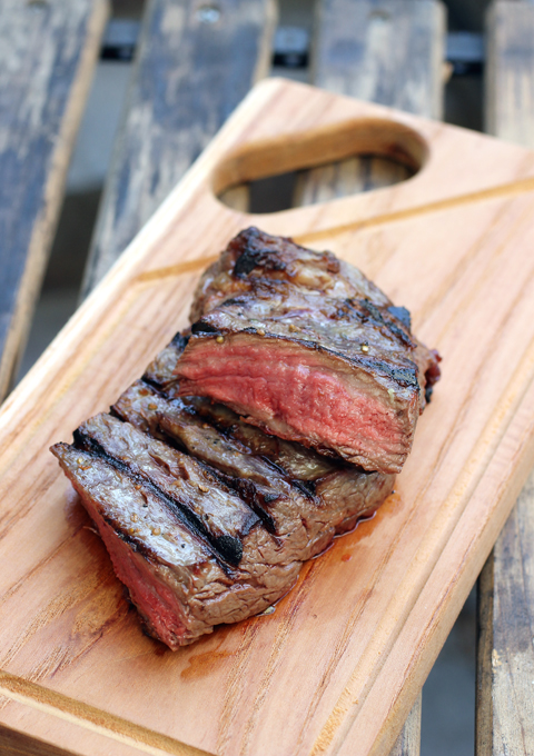 Let the meat come to room temperature for at least half an hour before you cook it. Season with salt and pepper. Cook it either in a very hot cast-iron pan on the stovetop or on a grill. Because it’s thin, it cooks fairly fast. It may need only 2 minutes on each side. After removing it from the grill, let it rest for about 5 minutes before cutting into it.