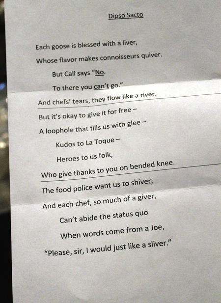 That was the scene on July 5 at La Toque restaurant in Napa, which famously held a “State of American Foie Gras” lunch to publicize the fact that it’s been two years now since it became illegal to produce or sell foie gras in the state. Which is why La Toque gave it away — charging guests nothing for the lunch. Instead, the restaurant held a contest, asking people to write in about why “California’s foie gras ban is foolish.” Twenty-five winners were chosen, each of whom were allowed to bring a guest.