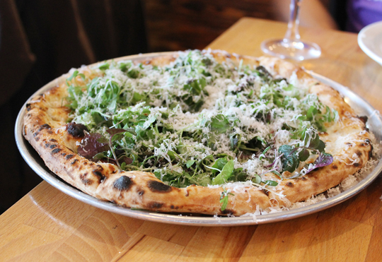 The “Field of Greens” ($15) is like a salad atop a pizza. Microgreens from Campbell’s Ecopia Farms get scattered over a bed of melty mozzarella. Lemon, olive oil and a shower of finely grated Parmigiano crown it. The greens are so deeply flavored on their own that they make this pizza special.