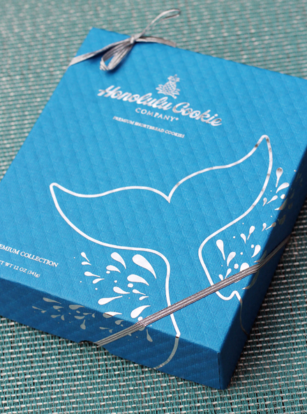 Twenty-four cookies are individually wrapped inside a deep sea-blue embossed Whale Collection Gift Box ($22.95). Inside there are eight flavors: Butter Macadamia, Pineapple Macadamia, Chocolate Dipped Macadamia, White Chocolate Coconut, White Chocolate Kona Coffee, Dark Chocolate Dipped Macadamia, Dark Chocolate Coconut, and Triple Chocolate Macadamia.