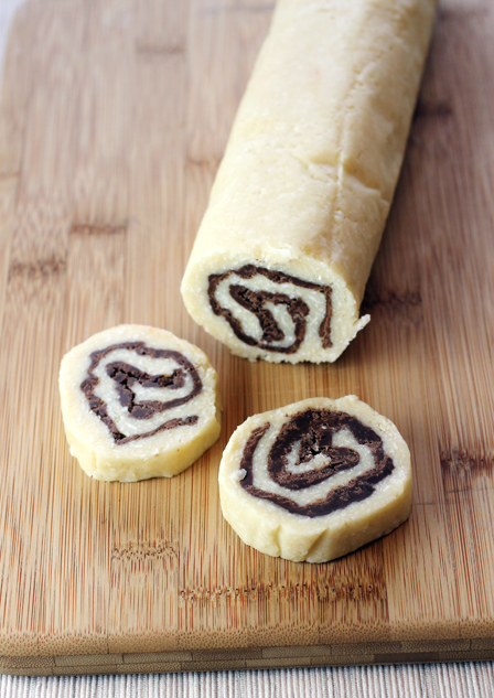 Roll out the coconut-inflected dough into a rectangle, spread with chocolate sauce made with condensed milk, then form into a log and refrigerate overnight.