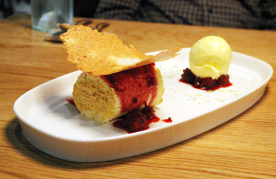 For dessert, we enjoyed the butterscotch mousse cake ($8), an ethereal spongecake roll wrapped around creamy mousse. A ball of coconut ice cream paired nicely. Blackberry compote added a pop of color, but I don’t know if it was needed, as it tended to overtake the lovely butterscotch flavor.