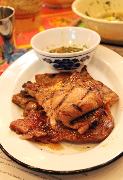 In fact, with at least one dish — the Moo Yang BBQ ($13) — you’re encouraged to do just that. Thin pork shoulder chops are marinated in whiskey, white pepper, coriander and garlic, and served alongside a dipping sauce of fish sauce, chiles and lime. The dish doesn’t come with a knife. Instead your server instructs you to just tear off a hunk with your fingers.