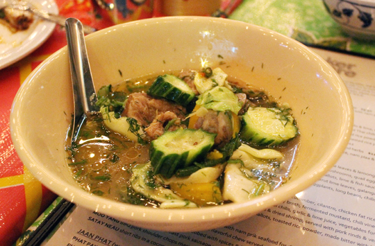Om Kra-Toog Moo ($12.50)  is a deep bowl of intense pork broth laden with pork ribs, cabbage, Thai eggplant, long beans, chilis and the lilt of dill. It’s a very porky tasting dish without being weighed down with a lot of fat and richness.