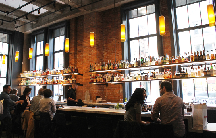 In looks, Mourad is worlds away from Aziza with its kasbah-feel in a series of intimate, dimly lit rooms. In contrast, Mourad has a sense of openness and contemporary elegance with its 19-foot-high windows, back-lighted columns, polished wood tables, sparkly dandelion-like light fixtures, and dramatic glass-enclosed wine bridge.