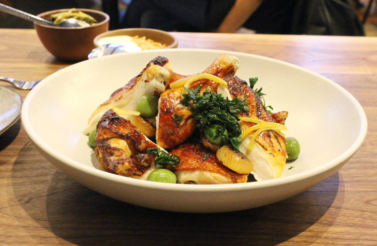 It’s chicken that’s at once homey yet elevated. Brined in olives and preserved lemons, it’s roasted until the skin takes on a burnished mahogany. Every bite is juicy, even the breast meat.