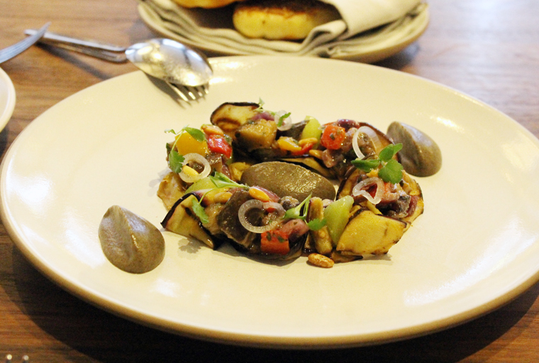 I’m sure we’ve all enjoyed baba ghanoush or other eggplant dips. But none presented as beautifully as the eggplant one ($16) here.