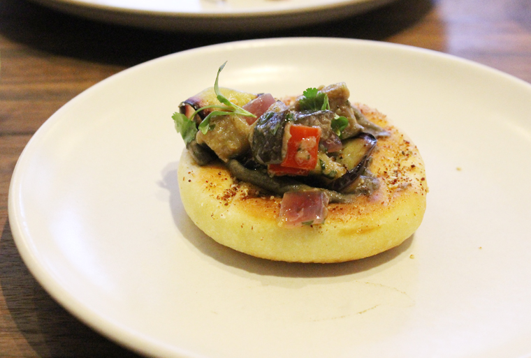 Quenelles of smooth, smoky eggplant puree are arranged with red pepper, and ribbons and chunks of grilled eggplant to create a play of textures. It’s served with two house-made flatbread rounds. They’re the size of crumpets, tender and chewy, and just heavenly. It’s almost a good thing that you get only two of them (though you can order more for an additional cost) because I could easily eat another and another.