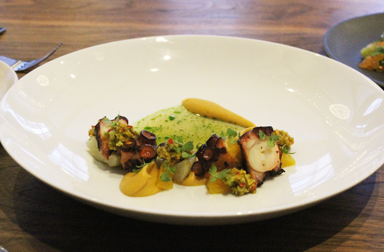 Meaty, tender octopus ($20) came garnished with braised artichokes and a smoky, peppery merguez broth splashed with kale oil.