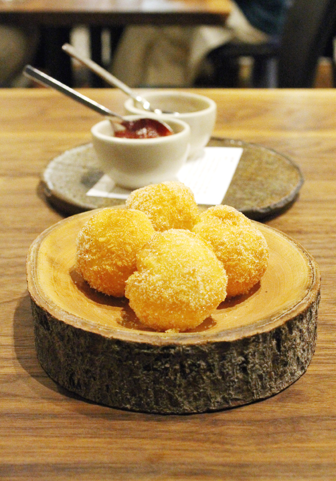 The kitchen offered to make a smaller order of the Sugar Puffs ($10 for six normally) for us to try. The golden fried doughnut holes are so airy that they’re practically hollow inside, much like a cream puff. Burnt honey and strawberry dipping sauces accompany them. And yes, they are every bit as irresistible as they sound.