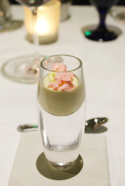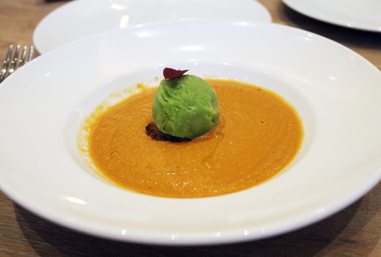 “Happy Boy Farms Tomato Gazpacho” ($18) is not the expected chunky version. Instead, this one is pureed until smooth with a scoop of melon-basil sorbet afloat in it. A drizzle of grassy olive oil adds just the right amount of lushness while still keeping everything fresh and vibrant tasting.