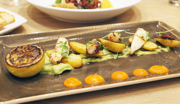 “Grilled Marinated Spanish Octopus” ($18) is the restaurant’s best seller. The octopus is wonderfully meaty-tender with a kiss of smokiness and accompanied by creamy fingerling potatoes and a smooth avocado puree, as well as dollops of peppery romesco sauce. Be sure to squirt the charred lemon over everything. The grilling tames its acidity and brings out a mellow bitter citrus rind flavor that really brings all the components together.