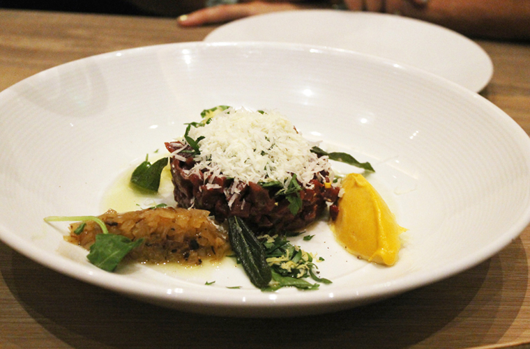 “Snake River Farms American Kobe Beef Carpaccio” ($16) is a true cut above because the beef is so tender and marbled. Capers, horseradish, lemon, Pecorino, and a Dijon-Worcestershire aioli add punchy piquancy that helps lighten the dish on the palate.