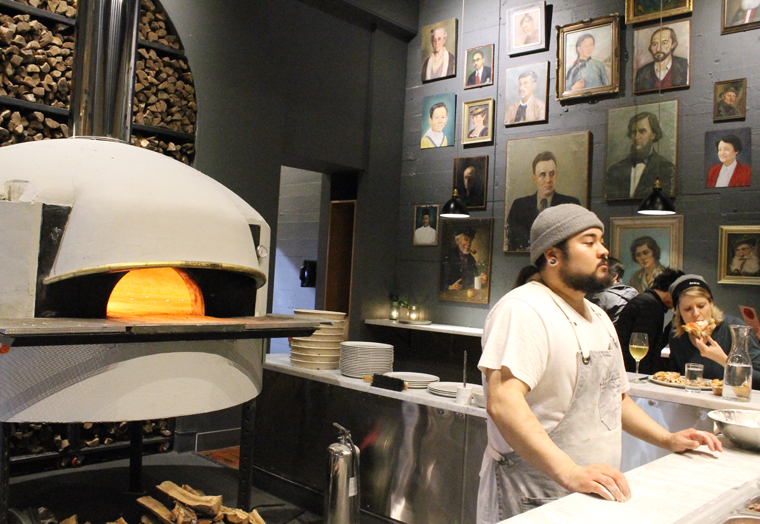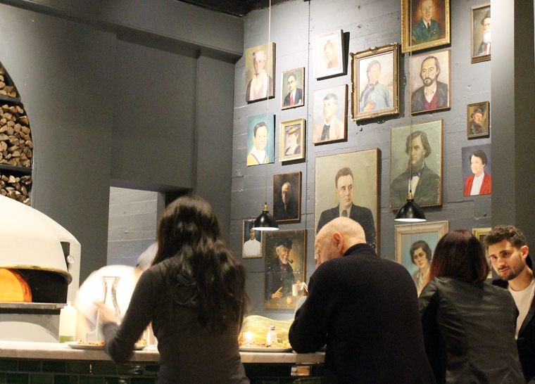 The dark gray walls enclose the space with a sense of coziness. The plethora of “Soviet-style” oil paintings hanging all over the walls add whimsy. Owner Jon Darksy apparently purchased them all online and put them on display in a nod to Del Popolo’s name, which translates to “of the people.” General Manager Essam Kardosh says the staff has so taken to them that they’ve made up back stories for each of them.