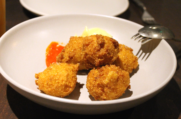 Normally, I don’t get too excited by hush puppies ($10). But these were outstanding, made with Anson Mills artisan cornmeal, which gave it an intense sweet corn flavor. Beautifully golden and crisp on the outside, they had a polenta cake-like texture on the inside. They came with soft, honey butter and a fiery house-made hot sauce, where a little definitely goes a long way.