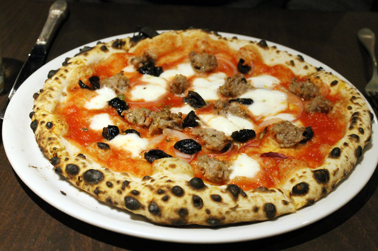 My husband chose the house-made sausage pizza ($18). It came smeared with a sweet, crushed tomato sauce, nicely seasoned sausage that tasted of fennel and thyme, black olives, milky mozzarella, and slivers of red onions.