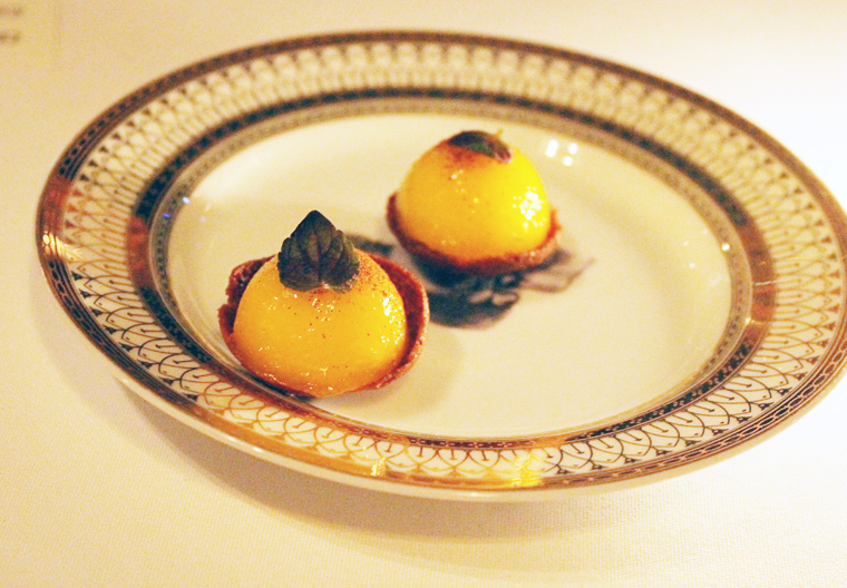 The finale was precious little balls of mandarin and pumpkin semifreddo, deep orange in color and bracingly ice-cold that almost jolts you into acknowledging your time here has come to an end.