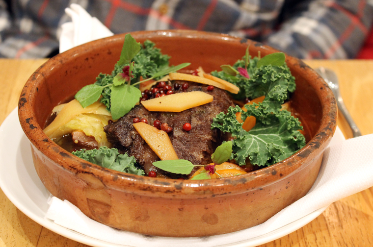 The entrees arrive in Spanish cazuelas. My husband’s braised beef cheeks ($22) are fall-apart tender, and sweetened up with fuyu persimmons, yams, and a scattering of pomegranate arils.