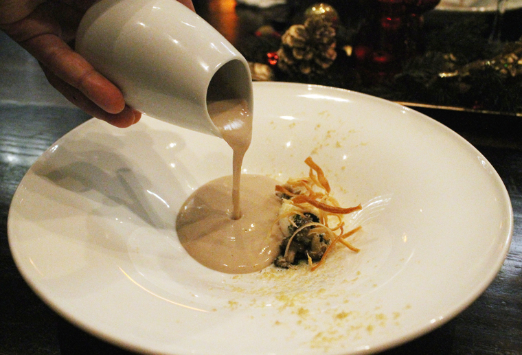 Chestnut soup was poured table-side. And it was a stunner. Thick, luxurious, and oh-so velvety, it was toasty with the gentle sweetness of the chestnuts. Mushrooms, salsify and a bit of indulgent foie gras garnished the deep bowl. This is the soup you wish you could have every Christmas.