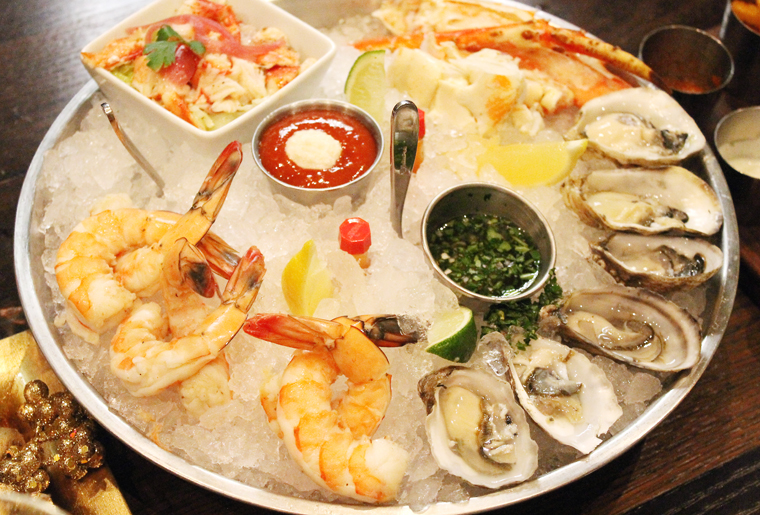 Next came platters of oysters on the half shell ($18) with Bombay Sapphire cocktail sauce, and a brimming shellfish platter ($48) of cracked crab, Alaskan crab legs, jumbo shrimp, and more oysters.