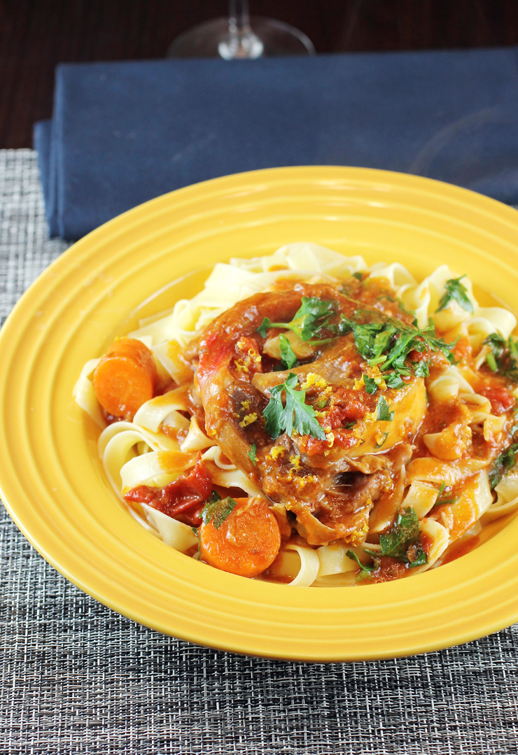 Hagar recommends serving it over linguini. I used egg noodles instead. If you’re using a can of imported diced tomatoes, you won’t need all of it for the braise. Save the rest as I did to toss with the egg noodles instead, before topping with the shank and some braising liquid. The flourish of fresh lemon zest at the end adds the perfect zing.