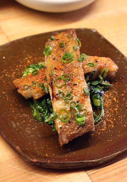 Short rib is painted with pear puree, giving it an otherworldly look, and served with fermented Korean pepper sauce, chile pepper threads and goji berries. It’s meaty and faintly sweet with just the faintest hit of spiciness.