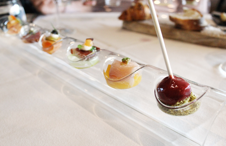 Next comes a gift from the chef, a stunning long glass cylinder that looks like an oversized test tube laid on its side with divots to hold tiny bites. From left to right, there is a cherry-glazed frozen foie gras lollipop that melts in your mouth like an ice cream on a stick; hamachi with pickled peaches and a pop of spiciness; Iberico ham with cantaloupe; a silky smoked salmon with Osetra caviar; a teeny morsel of Wagyu crudo flavored with sweet soy and dashi that is as rich as a pat of butter in your mouth; and King crab with pickled apples and radish sprouts.