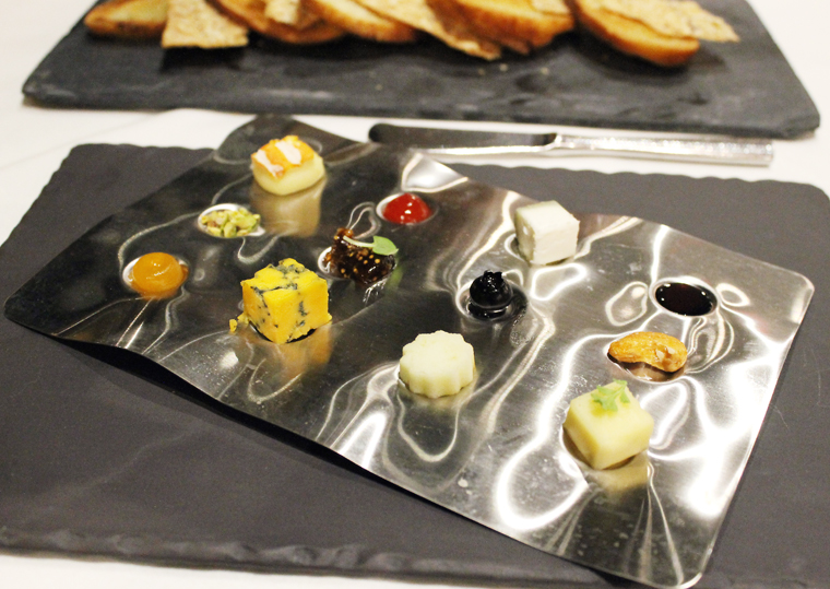 After all of that, comes a cheese course served in a large, artsy shiny metal, dimpled board. Each holds a cheese — French sheep’s, a combo blue-English cheddar that’s divine, aged French goat cheese, and black truffle American — along with accompaniments such as fruit preserves or a candied cashew. My husband wished all cheese courses could be like that — modest morsels that allow you to really savor each one, even after a hefty entree.