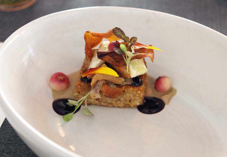 When you see oat cake with blueberries, you’re tempted to think “breakfast.” There is sweetness here, but it’s subtle from the pink lemonade blueberries from the farm (ombre hued with its blending shades of white to purple). And there is savoriness in the form of chanterelle and king trumpet mushrooms.