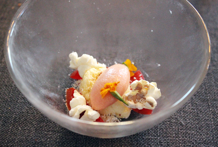 To cleanse the palate, there is pretty-in-pink plum sorbet with creme fraiche, poached plums, marigold flowers and unexpected popcorn that adds texture and whimsy.