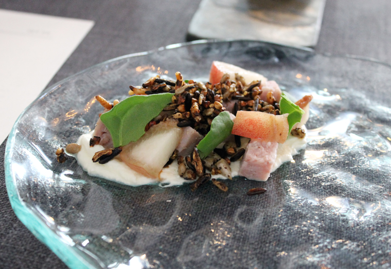 The farm’s rabbit shows up again in the second course — a firm rabbit pate (made with the animal’s liver and kidneys) arranged over whipped farmer’s cheese. Smoked white peach adds sweetness that goes beautifully with the pate, and the savory granola adds a fun toasty crunchiness to everything.