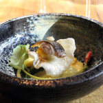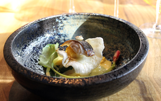 The first course brings house-made tofu, creamy and soft as pudding, hidden underneath garnishes of baby corn rings, pert summer savory, and the crunch of toasted hazelnuts. At the bottom is a gingery Thai-like dashi, all making for a dish that has garden freshness, but also tang and umami savoriness.