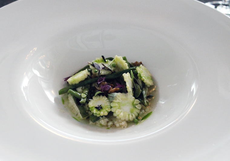 That’s followed by the last savory course, which is tender slices of beef along with compressed beef cheek get lightened up with zucchini three ways: grilled, pureed and pickled.