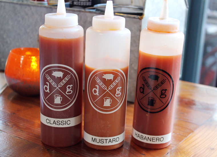 Don’t worry about digging in with your hands. On each table is a caddy of silverware along with packaged wet-ones. There’s also a trio of squeeze bottles holding different house-made barbecue sauces to add on as liberally as you like.