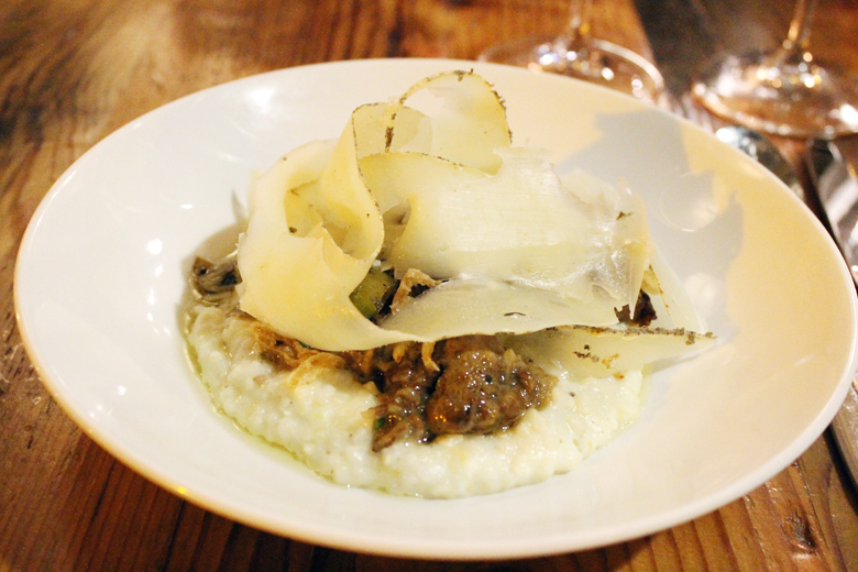 There’s usually about 11 different oysters on the half shell offered nightly ($2 to $3.75 each). We enjoyed three types: the briny-yeasty Beau Soleil from New Brunswick; BC, Coromandel from Coromandel Bay with its clean cucumber note, NZ; and an ever-favorite, the petite and sweet Kumamoto from Humbolt Bay, CA. They arrived on ice on a big platter with mignonette, cocktail and horseradish sauces. It’s a perfect way to start a meal here.