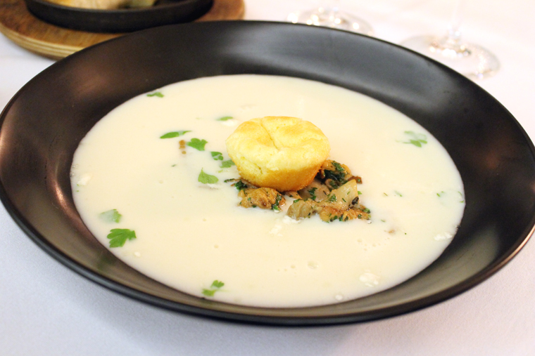 Choose from a $79 five-course tasting menu or a la carte offerings. We opted for the latter option, starting with a velvety, deeply flavorful cauliflower soup ($14) that is poured tableside over chanterelles and oyster mushrooms, as well as a mini parmesan souffle that’s a little like a popover.