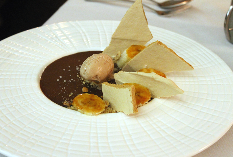 The chocolate Nutella pot de creme ($11) comes in a shallow bowl crowned with shards of crunchy bourbon meringue, Nutella ice cream and crackly bruleed banana slices. It’s a grown-up version of chocolate and banana pudding.