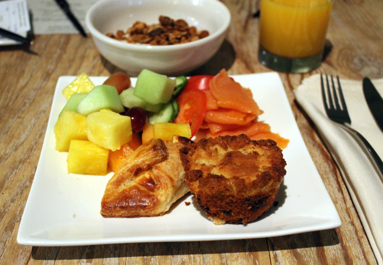 After sleeping in, we returned to the lobby for breakfast. There’s a spread of freshly baked mini croissants, muffins and scones, as well as fresh fruit, smoked salmon, yogurt and granola.