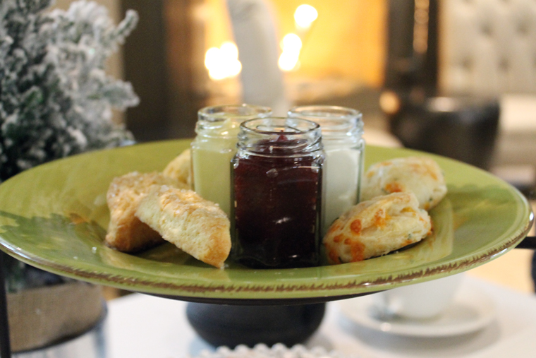 The middle layer has an array of little blueberry scones, cream scones and cheddar-chive buttermilk biscuits, accompanied by lemon curd, preserves and whipped cream. The bottom layer is a sweet lover’s paradise tiny eclairs, Russian tea cakes, coconut macaroons, sour cream coffee cake, lemon shortbread cookies, and truffles.