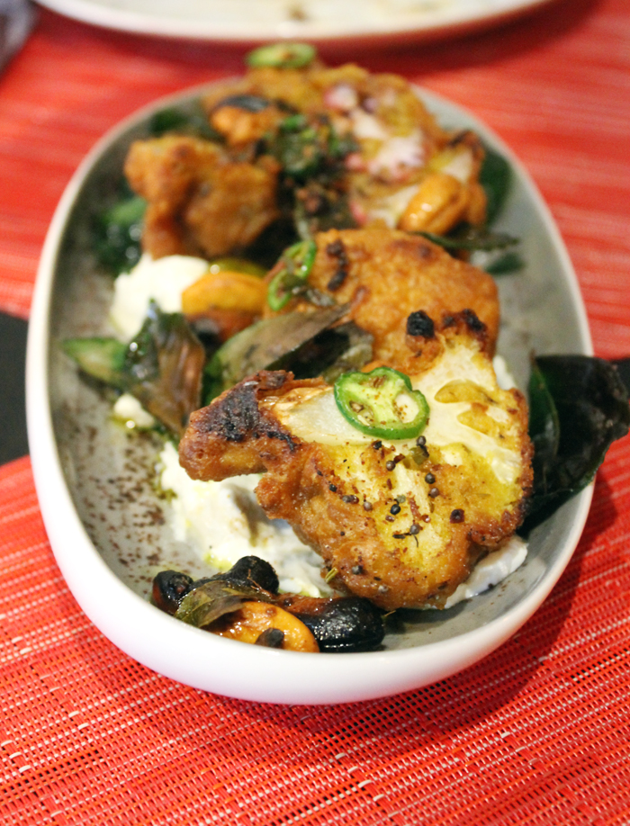 Cauliflower Pakora ($12) are florets that are battered and fried, then tossed with a mustard seed vinaigrette, frisee and a Dijon-honeysuckle emulsion. They definitely have a good kick of heat.