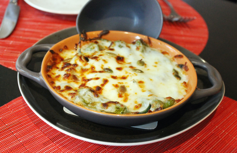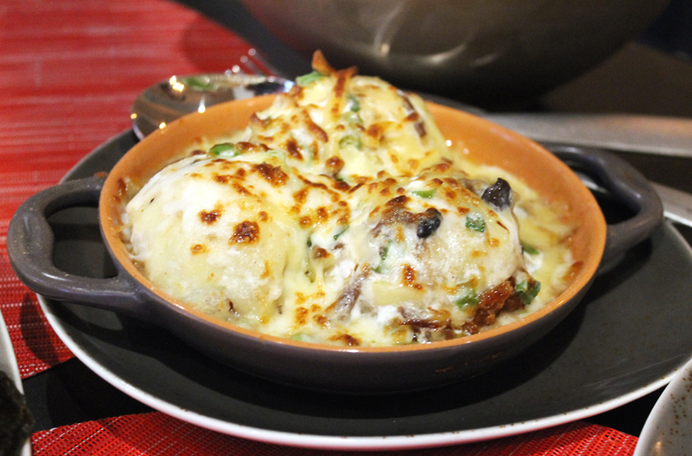 A cast-iron pan of Padron peppers is brought to the table on the house. I was surprised to see these peppers at this time of year, as they normally grow locally summer through fall. They are known as the Russian roulette of peppers because one out of every five is hot. But you can’t tell which it will be until you bite into it. These Padrons lay under a blanket of gooey melted mozzarella and Gouda, sort of like mini chiles rellenos.