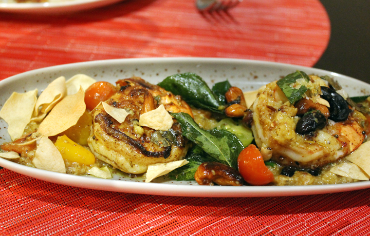 Daal Shrimp & Grits ($14) is a more fully realized dish. Garlicky, tamarind barbecue shrimp crown a bed of coarse white corn grits that do take on the texture of dal. The spicy curry-inflected grits get a reinforcement of curry leaves and charred cashews.
