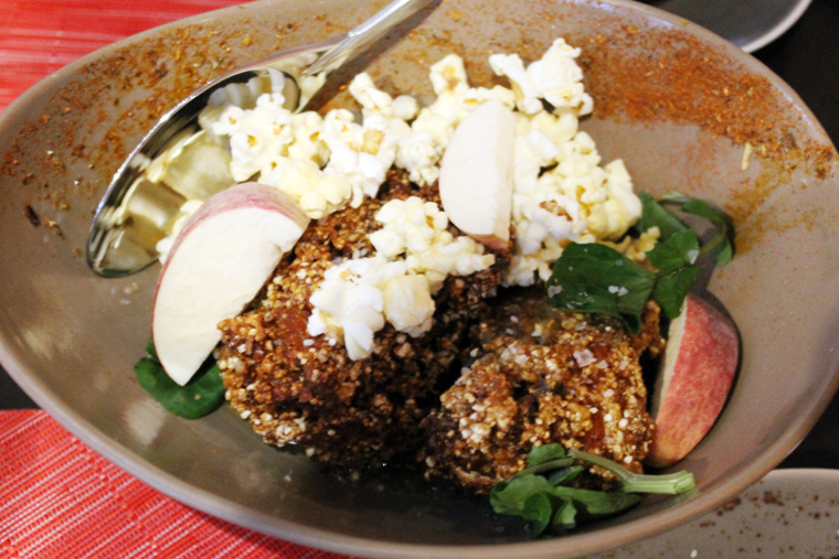 Mashed Potato Croquettes & Tots ($15) was rather confounding, as any semblance of crispiness was missing from this dish. And that’s what you long for with anything named croquettes or tots — the wonderful interplay between crunch and custardy softness. Here, it was all softness, like big balls of mashed potatoes smothered with mushroom gravy that didn’t have a very pronounced loamy funghi flavor, either.