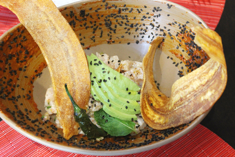 The Thai Kampachi Kitfo ($16) is a play on the Ethiopian steak tartar dish. Only here, it’s done ceviche-style with Kampachi cubes tossed with Serrano chili, berbere spices, lemon juice, and tangerine oil. You can scoop up the Kampachi with the two long, curving fried plaintain chips garnishing the dish. It’s a beautiful dish that has nice acid and balanced heat. But if you’re a fish purist, you might find the taste of the Kampachi rather lost in translation.