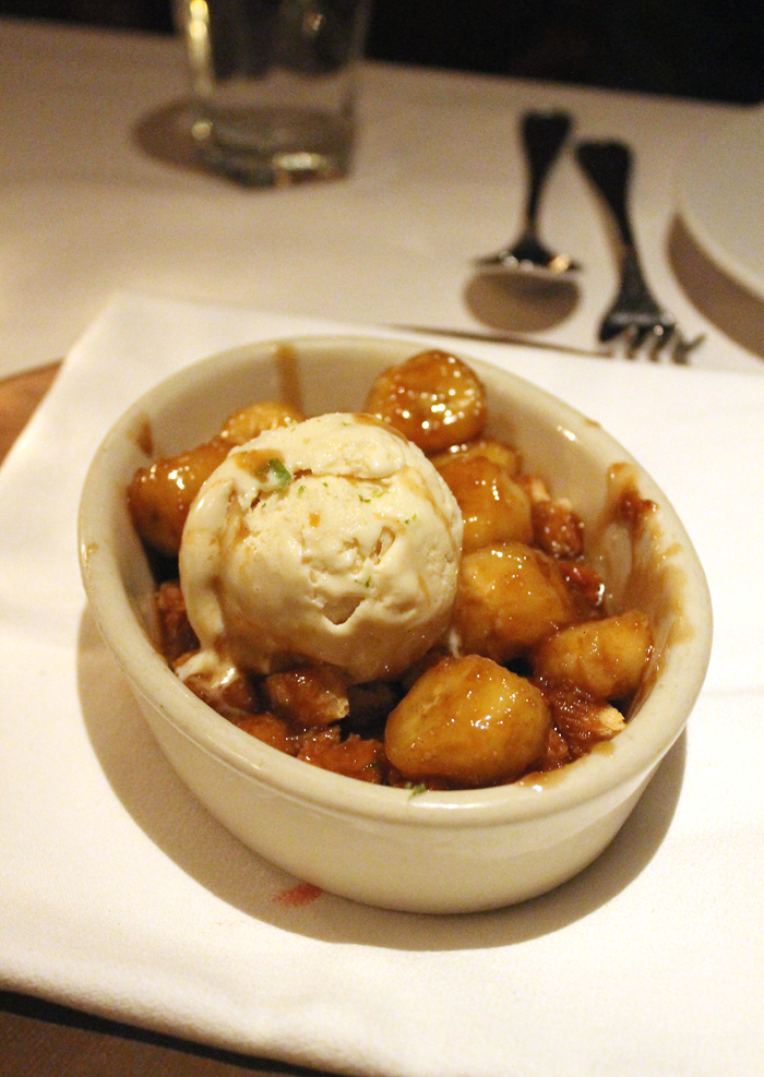 The warm bananas are garnished with brioche croutons and a big scoop of vanilla frozen custard.