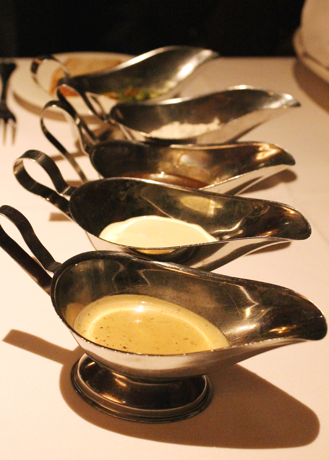 The restaurant is known for its steaks, which are now sourced from San Francisco’s Bryan Flannery, which specializes in grass-fed, grain-finished beef that’s dry-aged. My husband opted for the namesake Alfred’s Cut ($75), a 28-ounce bone-in rib eye that the restaurant is famed for. It arrived medium-rare, just as he requested, seared until crusty outside and juicy within. Although the steak usually comes with your choice of one sauce, our server brought out all six for us to try: brown butter bernaise, whipped horseradish, three-peppercorn, giardiniera, lemon-caper butter, and oxtail bordelaise. My favorites were probably the bernaise, because how you can never go wrong with brown butter, and the oxtail bordelaise because the beefy sauce amplified the taste of the steak even more.