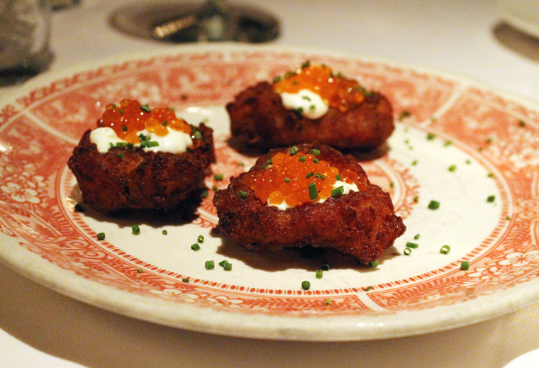 The tater tots ($18) look more like mini potato pancakes. Topped with creme fraiche and smoked trout roe, they are just the palate awakener made to go with a good cocktail. The oxtail-foie gras croquettes ($13) are deeply golden on the outside and super meaty within. They are stuffed with shredded oxtail meat with a molten center of foie, and pretty hard to resist.