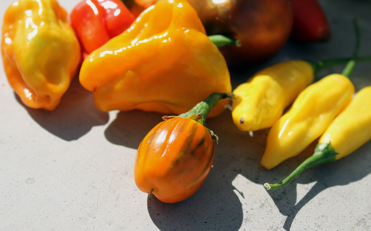 The garden grows about 150 different varieties of fruits, vegetables and herbs annually. Among the more unusual items are Peruvian Aji Amarillo peppers; Japanese Trifele tomatoes; teeny orange eggplants that are common to the west coast of Africa; and something called Buzz Buttons, tiny bright yellow buds that have a numbing effect on the palate akin to Szechuan peppercorns.
